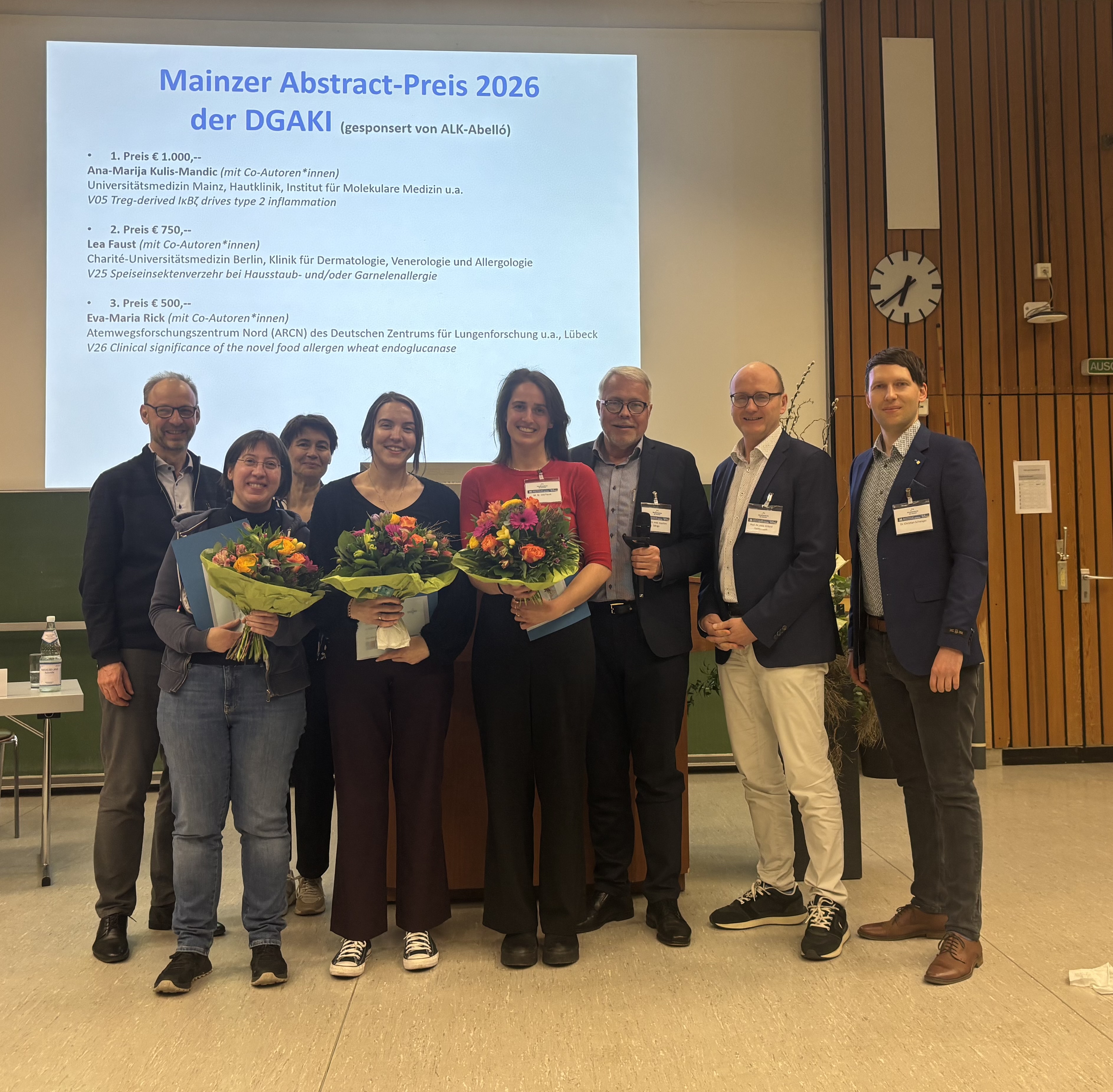 Auch in diesem Jahr wurde auf dem Mainzer Allergie- und klinische Immunologie-Workshop der Frühjahrstagung der DGAKI, der Mainzer Abstract Preis, gesponsert durch die ALK-Abelló GmbH, an Nachwuchsforschende vergeben. Bei der Vielzahl eingereichter hochwertiger wissenchaftlicher Arbeiten fiel der Fachjury die Wahl nicht leicht. Der erste Preis in Höhe von 1.000 € ging an Ana-Marija Kulis-Mandic aus Mainz für den Kongressbeitrag „Treg-derived IκBζ drives type 2 inflammation“. Der zweite Preis, dotiert mit 750 €, wurde an Lea Faust aus Berlin für den Beitrag „Speiseinsektenverzehr bei Hausstaub- und/oder Garnelenallergie“ verliehen. Der dritte Preis in Höhe von 500 € ging an Dr. Eva-Maria Rick aus Borstel für den Beitrag „Clinical significance of the novel food allergen wheat endoglucanase“.